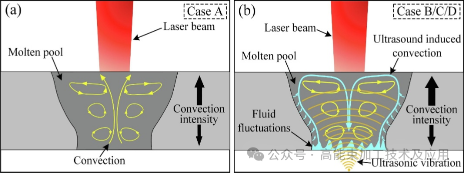 Figure 2. Effect of ultrasound on fluid flow in the molten pool: (a) Without ultrasound; (b) With ultrasound[1].