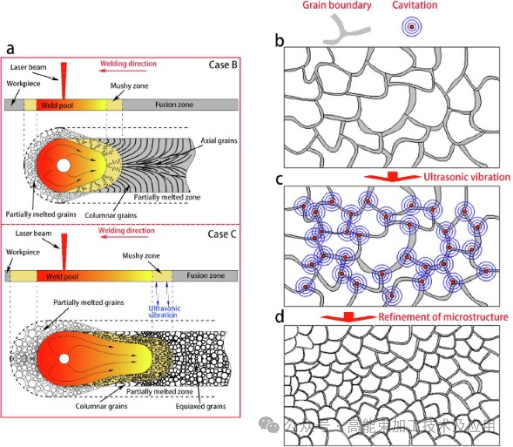 Figure 3. (a) Shape and macroscopic morphology of the molten pool with and without ultrasound; (b) Microstructure without ultrasound vibration; (c) Microstructure refinement process; (d) Refined microstructure formed under ultrasound vibration[2].