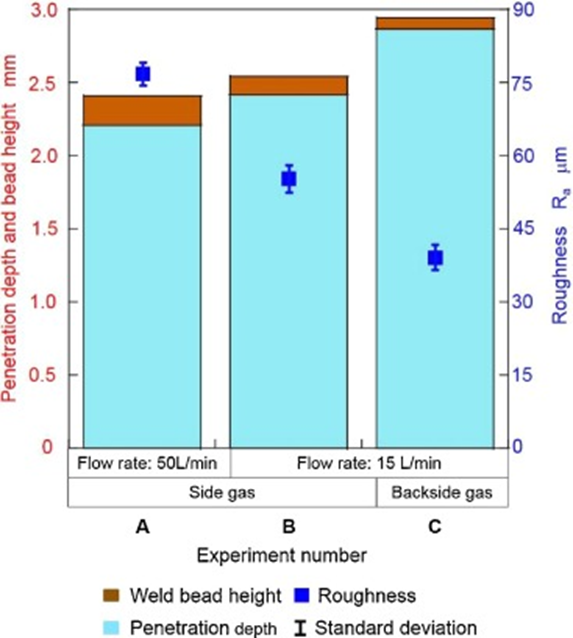 Figure 2 illustrates the variations of reinforcement, penetration depth, and surface roughness. Reducing gas flow rate (from 50 L/min to 15 L/min) increases penetration by about 9%, decreases reinforcement by about 40%, and reduces surface roughness by about 28%. Changing the shielding gas direction from back to side further increases penetration by about 18%, decreases reinforcement by about 37%, and reduces surface roughness by about 29%. Overall, low-flow back shielding gas achieves high-quality welding with deep penetration, low reinforcement, and low surface roughness.