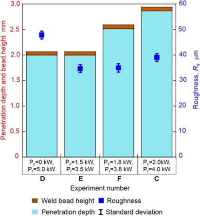 Figure 4. Changes in reinforcement, penetration, and surface roughness at different power densities