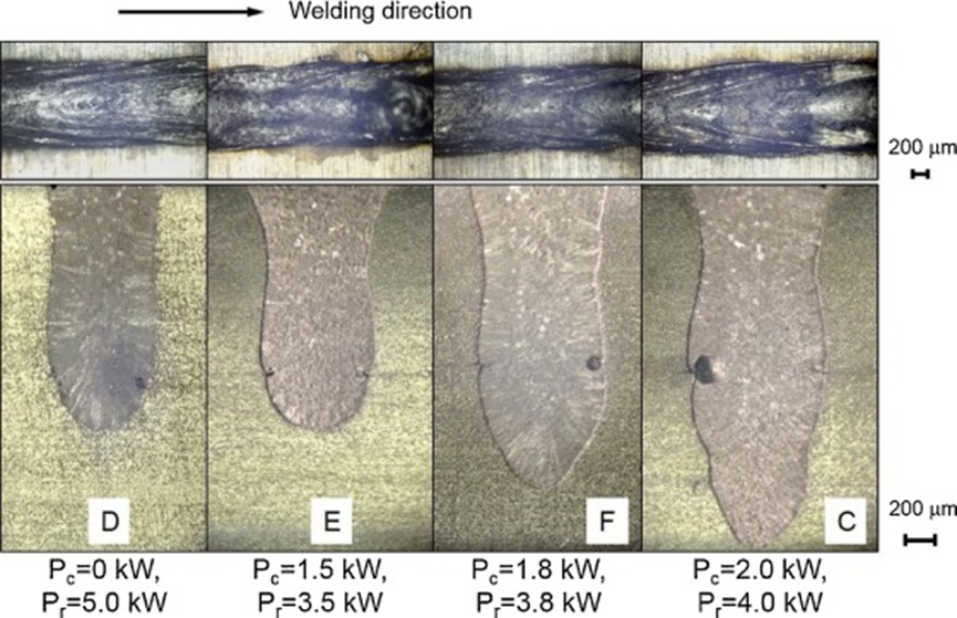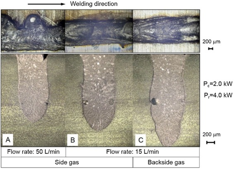 Figure 3 shows weld surface and cross-sectional appearance under different power densities, with nitrogen shielding gas supplied from the back at 15 L/min. The total laser power increases gradually from 5.0 kW to 6.0 kW.