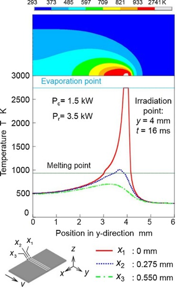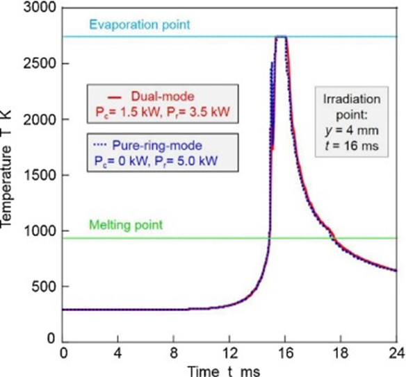 Figure 6 compares temperature history between dual-mode welding and pure ring-mode welding at t = 16 ms, transverse to the welding direction. Both cases have a total power of 5.0 kW. Temperature fluctuations occur due to the gap between the ring mode and fiber center. In both cases, the peak temperature appears at the laser beam center, with similar temperature histories, but the peak temperature in dual-mode welding is higher. Variations in peak temperature greatly influence weld appearance, as they affect keyhole formation and molten metal behavior.