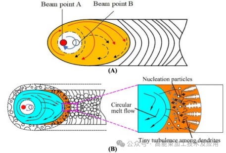 As shown in Fig. 4, related simulation studies indicate that under oscillating beam action, the molten pool develops distinct mushy, liquid, and solid regions. The wobbling trajectory (such as the “∞” path) alters the local temperature gradient (G) and solidification rate (R), triggering transformations from planar to columnar or even equiaxed grains.
